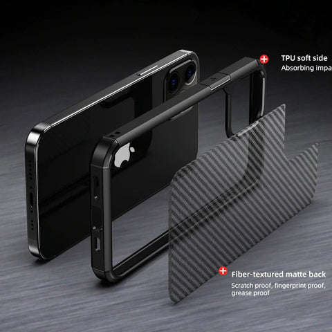 Калъфът е проектиран с прозрачен гръб и допълнителна карбонова текстура. Страните на кейса са изработени плътен TPU материал, който осигурява стабилност и защита без компромис в дизайна. Удароустойчивата Рамка е прецизно оформена, като поема и разпределя силата при падане.